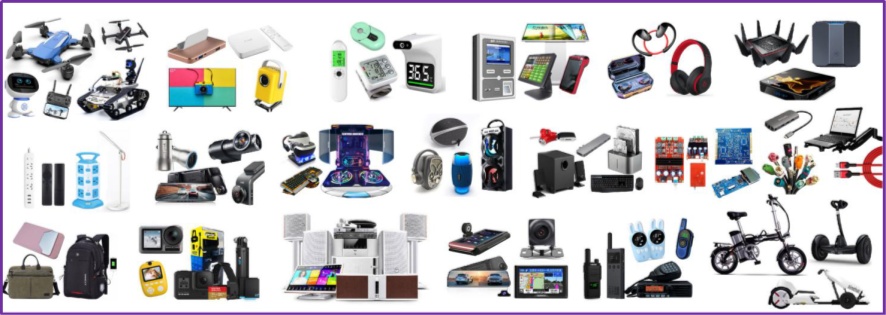 智能手机、平板电脑、笔记本电脑、可穿戴设备、无人机、机器人、相机、记录仪、电子礼品、电子书、乐器、电子玩具、电娱游戏机等;