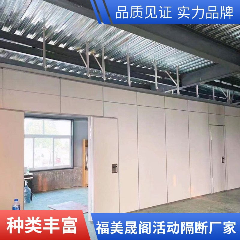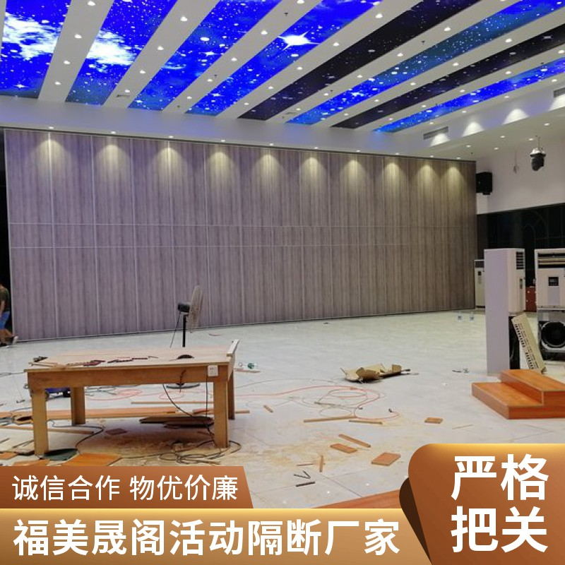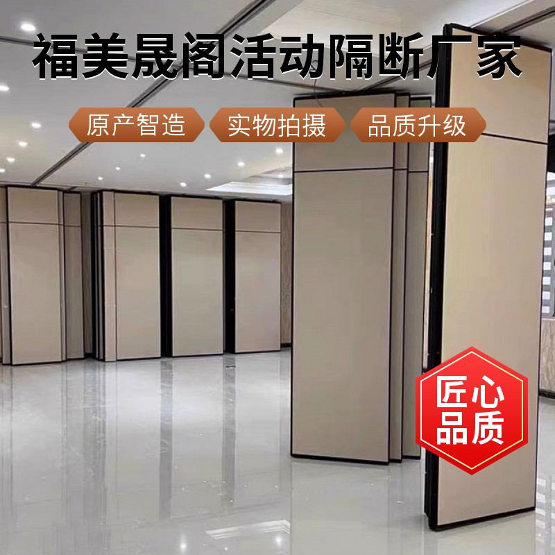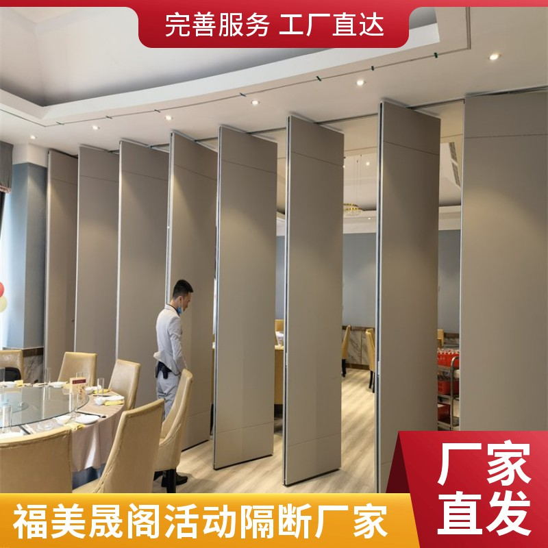 福美晟阁移动隔墙可分为单论和双轮两种做法,根据现场摆放条件不同可以设计出多种多样的风格,且表面装饰材料选择性大,可选择如:布面软包,布面硬包,防火板,亚克力板、铝板喷漆、玻璃、油画布等材料进行装饰,以配合整体设计风格,无需地轨,完全悬吊系统。可根据隔音、高度、预算等要求选择不同型号(100型、85型、65型、超高型)推拉灵活,可折叠摆放,不占用原有空间,广泛应用于酒店宴会厅,展览厅、餐厅、会议室、培训中心、报告大厅等场合的空间灵活切换与分割。