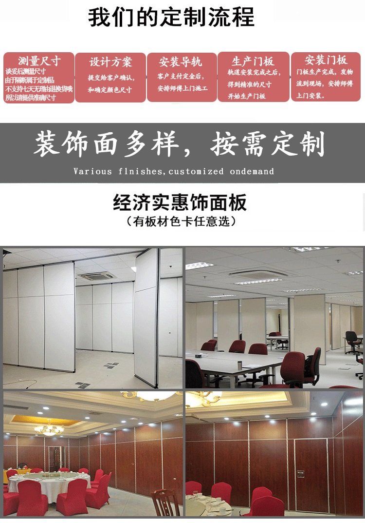 4、隔热、防火。活动隔断的隔热性能优良,在酒店、展厅中,可以根据不同入座率,把大空间分割成小空间,以降低空调电耗;活动隔断采用的是高效防火材料制作,防火性能良好。