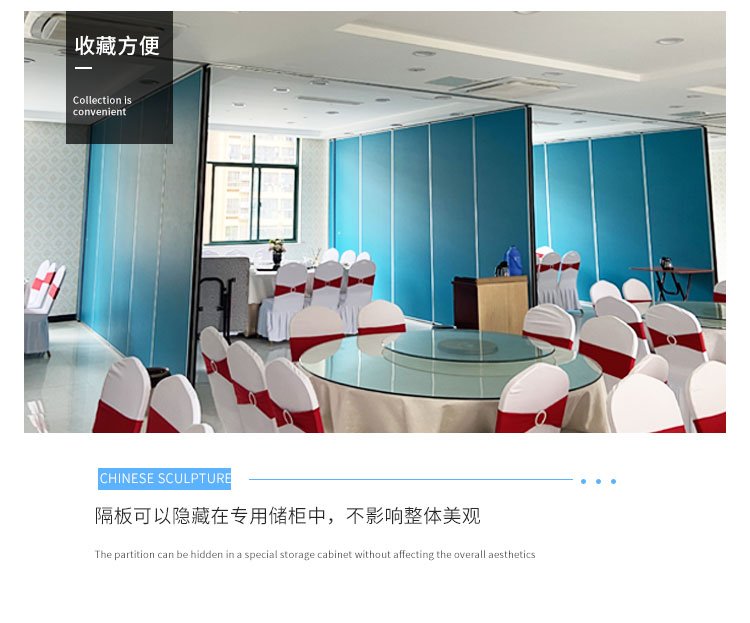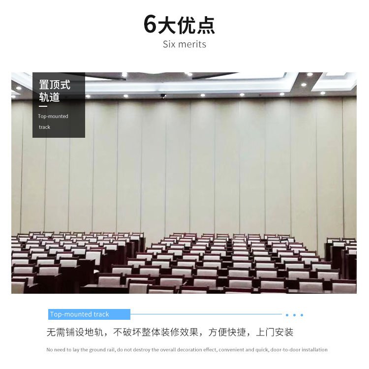 活动隔断墙可以根据自身的需要将室内空间分割成小空间,也可以将小空间连接成大空间,与一般墙体的功能无异,但是它还有一般墙体没有的优势,那就是可以自由活动,自由组合。活动隔断墙的特点有很多,比如不需要在地上安装轨道,只需要将轨道安装在天花板上,使得地面不至于看起来特别繁杂,也不需要随时清理。