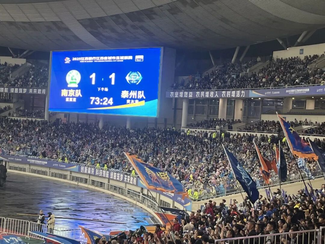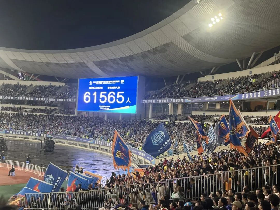 10月18日夜,“苏超”首场半决赛在国缘发祥地南京开战。南京奥体中心的雨与呐喊交织!天上的雨根本挡不住“苏超”的热情!南京奥体中心现场观众人数达61565人,再度刷新“苏超”单场上座人数纪录,以及全国业余足球赛事上座人数纪录!把苏超半决赛氛围感直接拉满!点球大战9轮才分胜负,又是一个奇迹。
